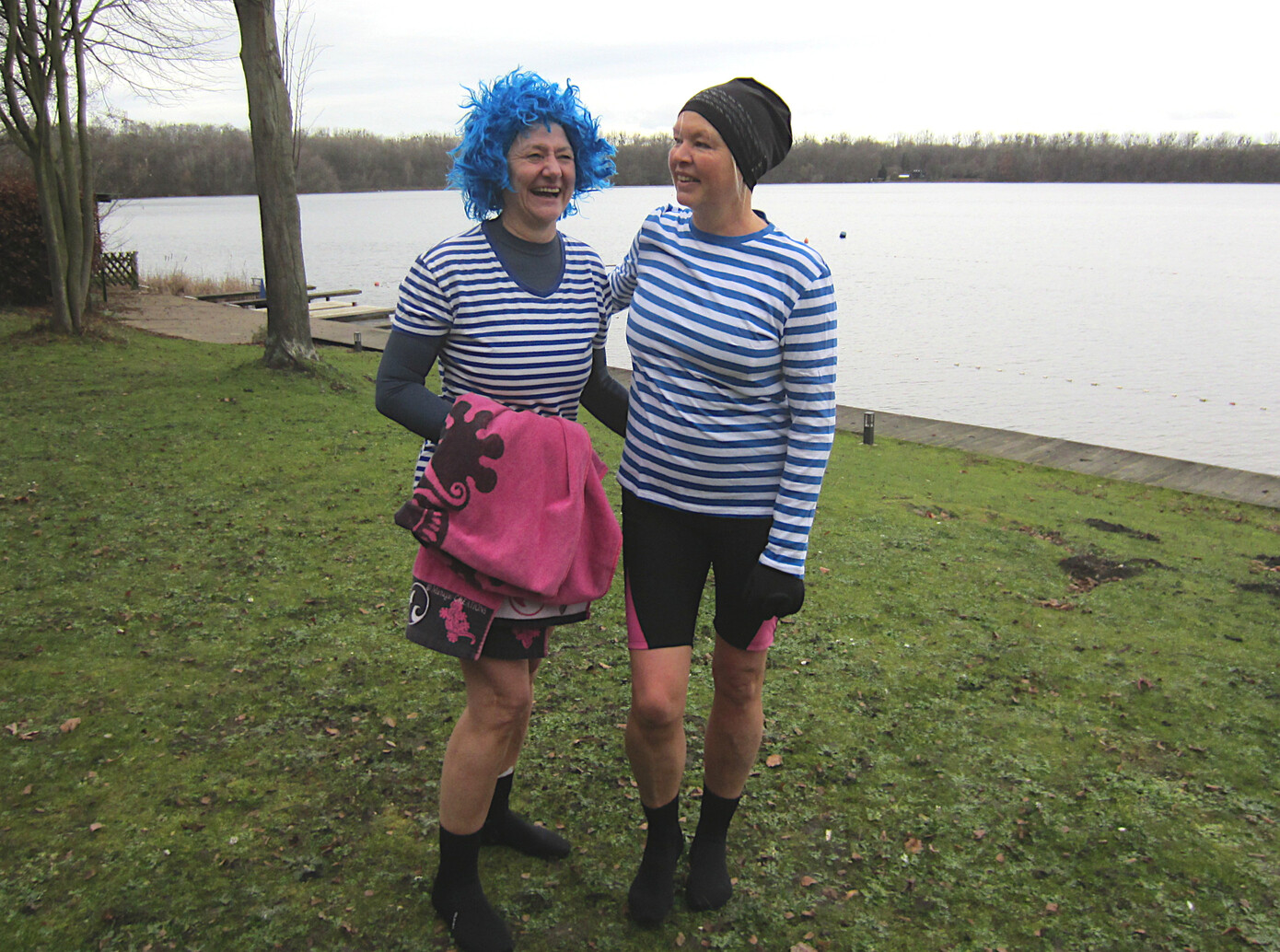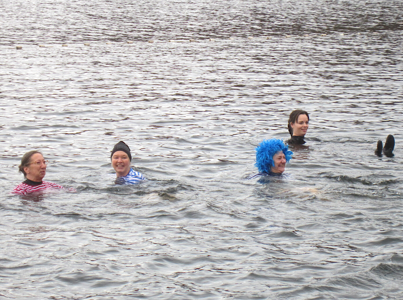 Manche waren voller Vorfreude, andere mit einem gesunden Respekt und einer ängstlichen Vorahnung, wie es denn werden würde und „ob man es wirklich schafft, hineinzugehen“, so eine Teilnehmerin. Einige waren kostümiert, andere hatten sicherheitshalber ihren Neoprenanzug an. Und manch Unerschrockene/r wagte das Eisbad erstmalig und nur in Badehose oder Badeanzug.