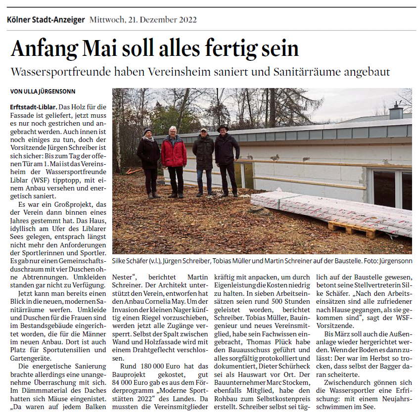Wir haben jetzt endlich separate Umkleiden und Duschen für Damen und Herren in moderner, zeitloser Ausführung, die den heutigen Anforderungen genügen. Außerdem sind weitere Lagerungsmöglichkeiten für Sport- und andere Utensilien entstanden. Der gesamte Gebäudeteil wurde mit den Funktionsräumen nach aktuellen Standards energetisch saniert. Im Mai 2023 soll alles fertig sein. Der Sommer kann kommen!